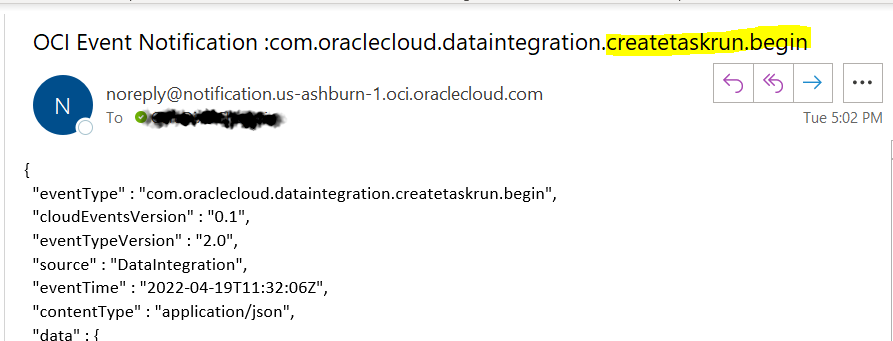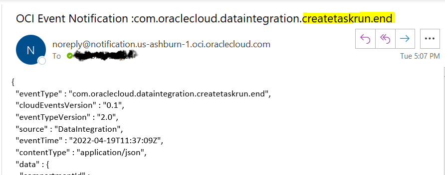 You have configured a Notification service and tied an event to it with a specific compartment. When a job status changes in OCI Data Integration, an email notification will be sent to the email address specified. You can also use this to trigger an event only when a specific attribute value is set, such as trigger when task ends in ERROR status;