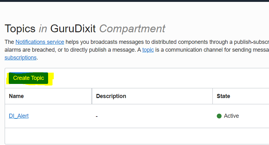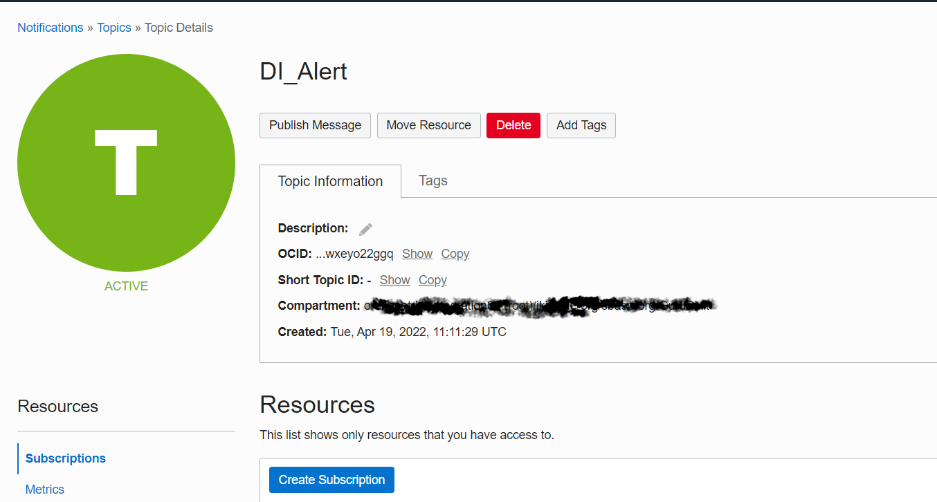 Topic – A communication channel for sending messages to the subscriptions in the topic. Each topic name is unique across the tenancy.