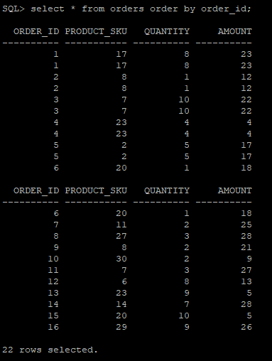 On the source we have the following data set. We have filtered the amount_in_warehouse because we have used also a filter statement in the pump parameter file: