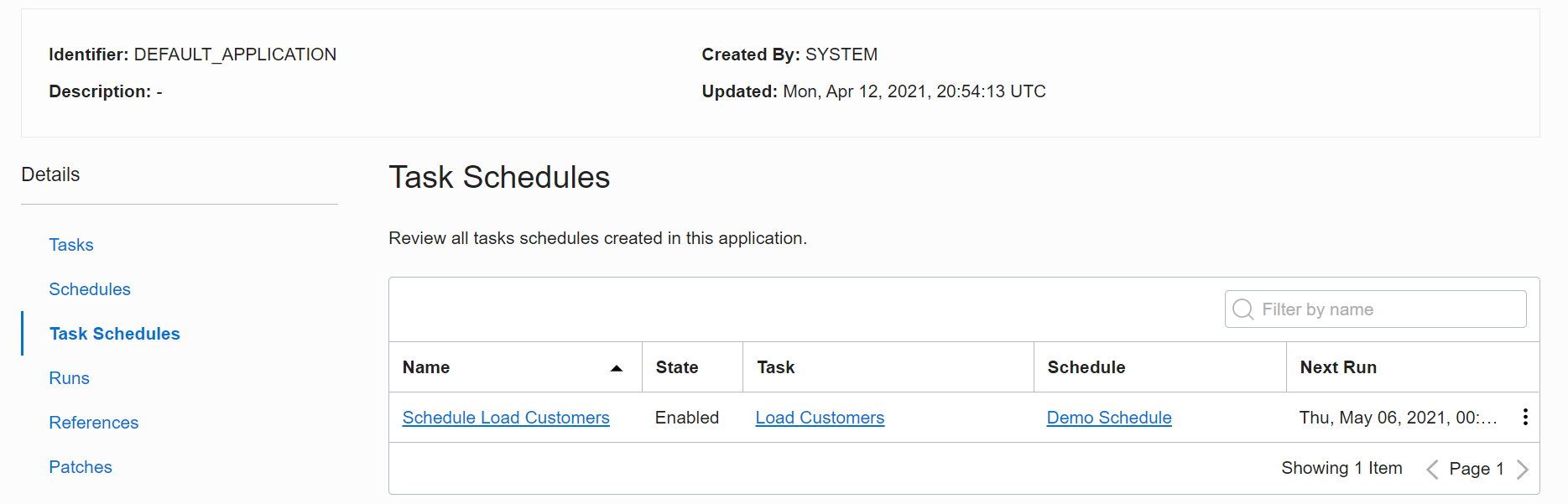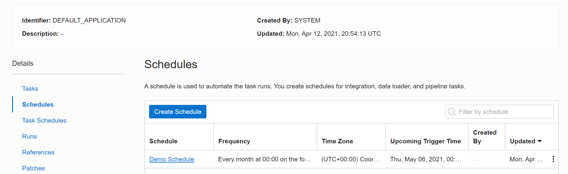 scheduler provides a user the ability to schedule tasks to run at a predefined time and interval without manually running a task. A schedule determines how often the scheduler runs. In Oracle Cloud Infrastructure (OCI) Data Integration users can schedule Data Loader taskIntegration taskSQL task and Pipeline task.