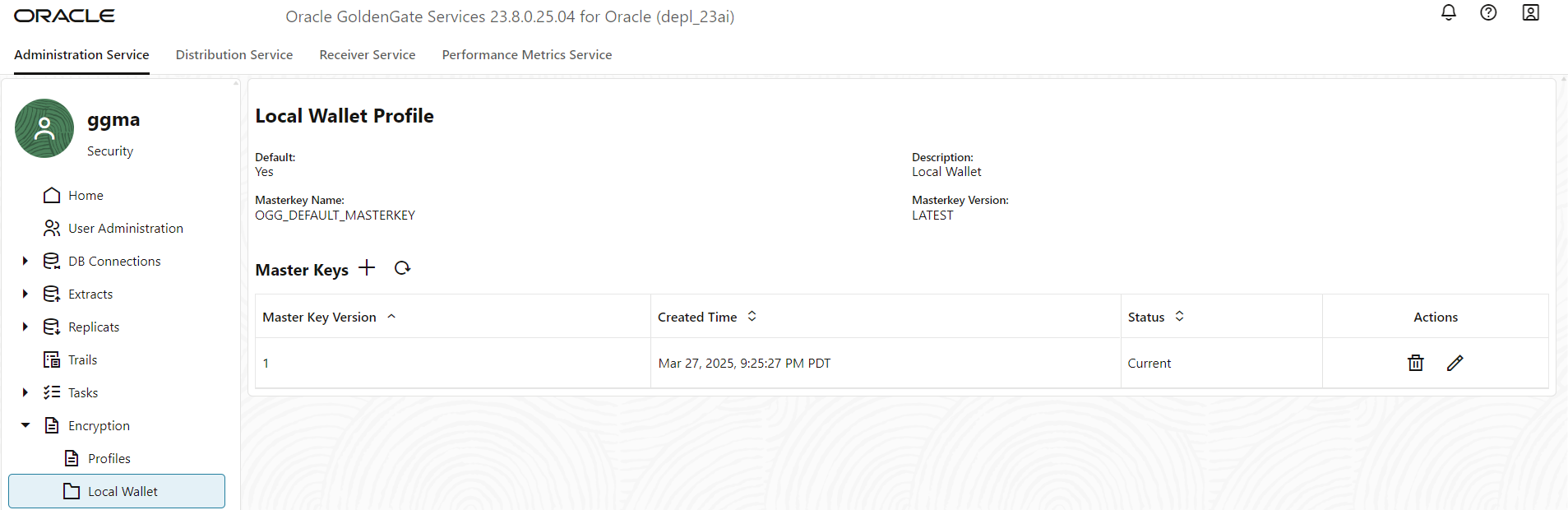 When using the Local Wallet Encryption Profile, the Master Key, as the name implies, is local to the GoldenGate deployment. It is the administrator’s responsibility to copy the Master Key wallet to the target system. This task must be performed during implementation and whenever the Master Key is rotated.