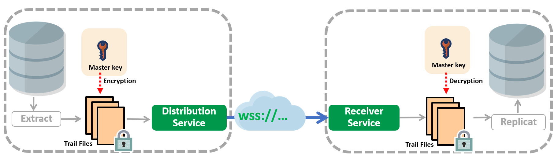 With GoldenGate Trail File Encryption, each Trail File generates a Data Encryption Key (DEK) that is used to encrypt the business data within the Trail File. While Extract encrypts the Trail File with this key, Replicat uses it for decryption. This DEK is encrypted using the Master Key. Therefore, the Master Key needs to be shared with the target destination. You have to securely transfer the Master Key from the $OGG_VAR_LIB/wallet directory to the GoldenGate target deployment.