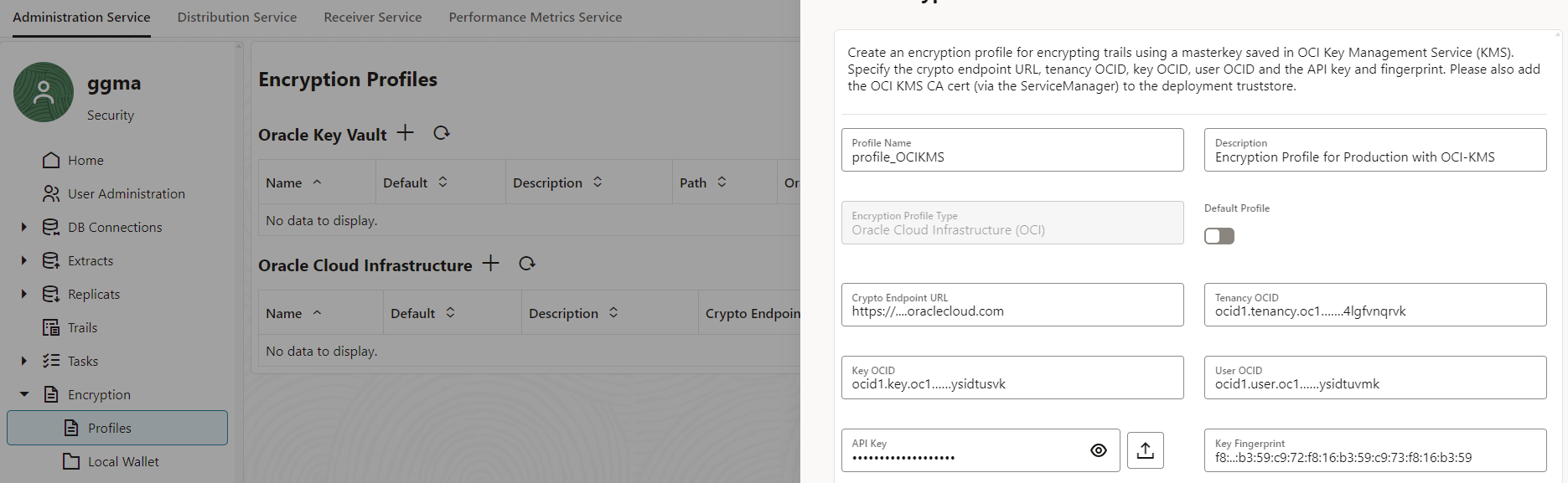 If you set the Encryption Profile as the default, the steps will be the same as those for the Local Wallet Encryption Profile. However, if you don’t want to use the OCI-KMS Encryption Profile as the default, you will need to modify the Extract and Replicat processes to use this specific profile instead.