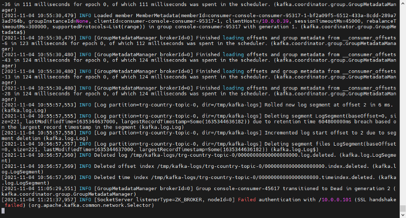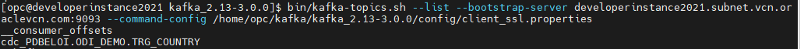 bin/kafka-topics.sh –list –bootstrap-server <host>:9093 –command-config /home/opc/kafka/kafka_2.13-3.0.0/config/client_ssl.properties