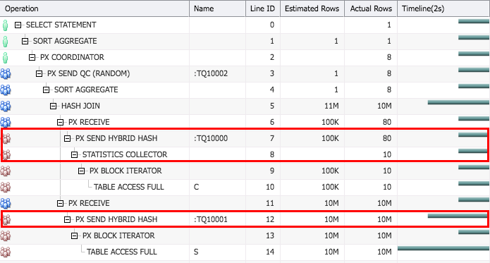In this example table C is distributed by broadcast and table S is distributed by round-robin as the number of rows from table C is 10 and the DOP is 8. You can find this out by looking at the number of rows from table C (line ID 10), which is 10, and the number of rows distributed at line ID 7, which is 80. 10 rows were scanned and 80 rows were distributed, this is because DOP was 8 and all 10 rows were broadcasted to 8 PX servers. For an easier way to find out the actual distribution method used at runtime, please see an earlier post that shows how to do it in SQL Monitor.