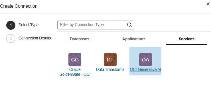 First step is to connect to OCI Generative AI service which will be used for generating Vector embeddings. Go to Connections menu in Data Transforms and find OCI Generative AI service in the Services section.