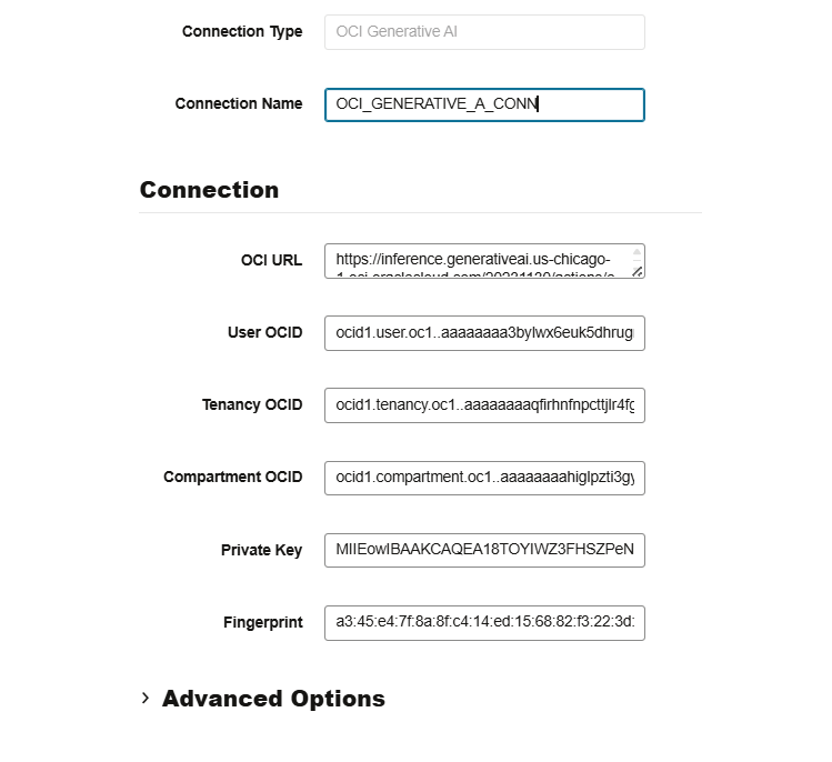 OCI URL – The endpoint URL of the OCI Generative AI service.