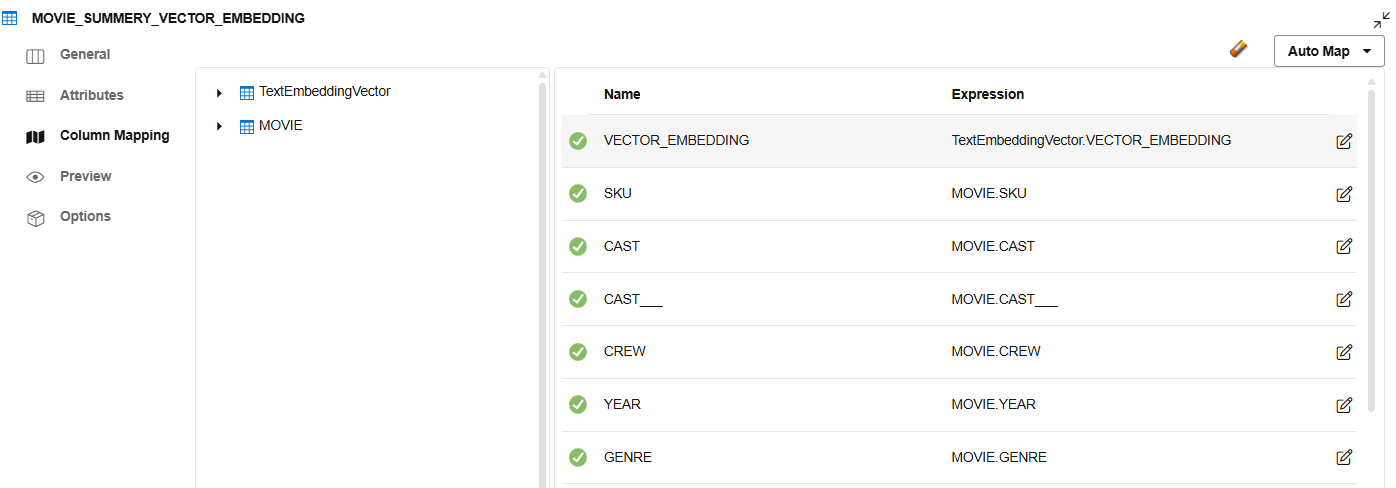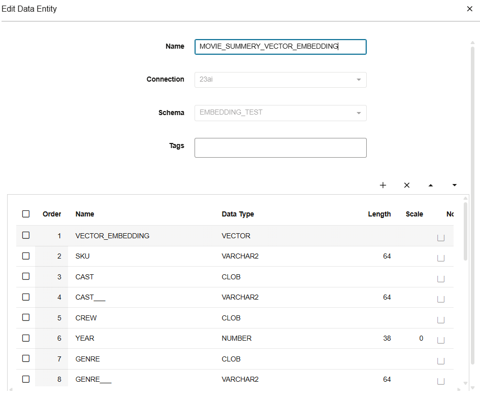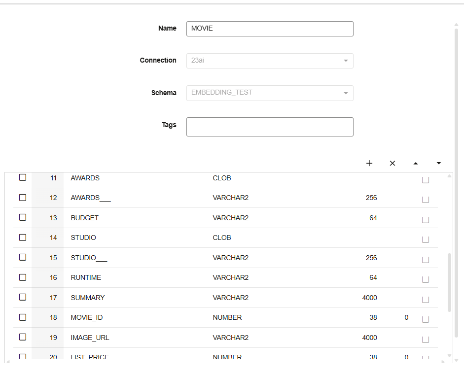 Import the source and target table definitions in the Data Entities menu. In this example the source table MOVIE contains data for movies. There is a SUMMARY column that will be the source for Vector embedding.