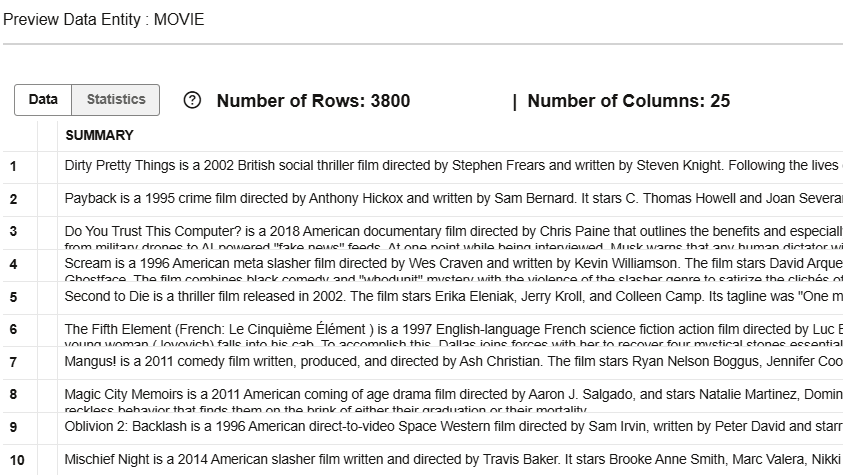 This SUMMARY column has long textual summary of movies. After we create Vector embedding for this column, it will be possible to run similarity search queries on movies table and possibly use the Vector embedding for other ML/AI applications.
