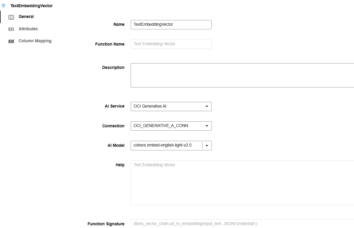 Select the AI Service, Connection and the AI Model in the General section. The Connection is the previously defined OCI Generative AI service and the AI Model should be appropriate for your usage. If not sure, then consult with the application user using the embedding for the right AI model.