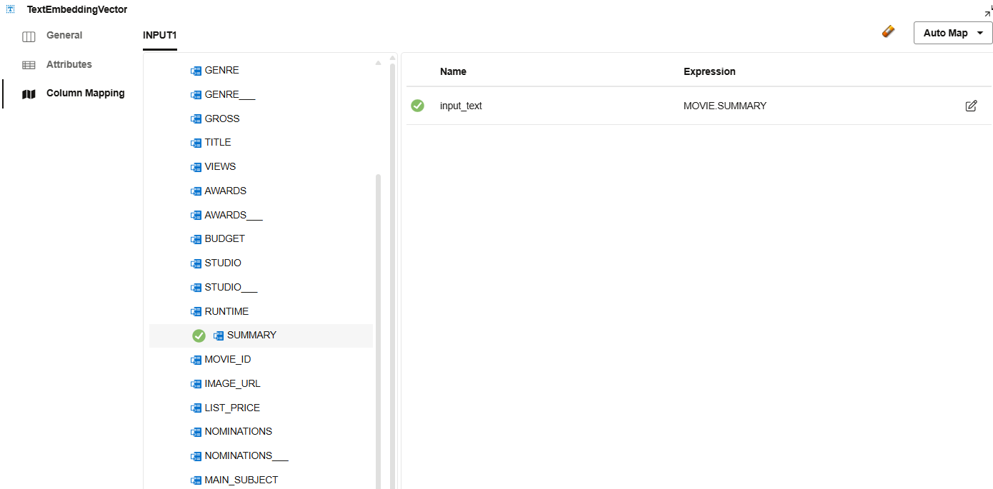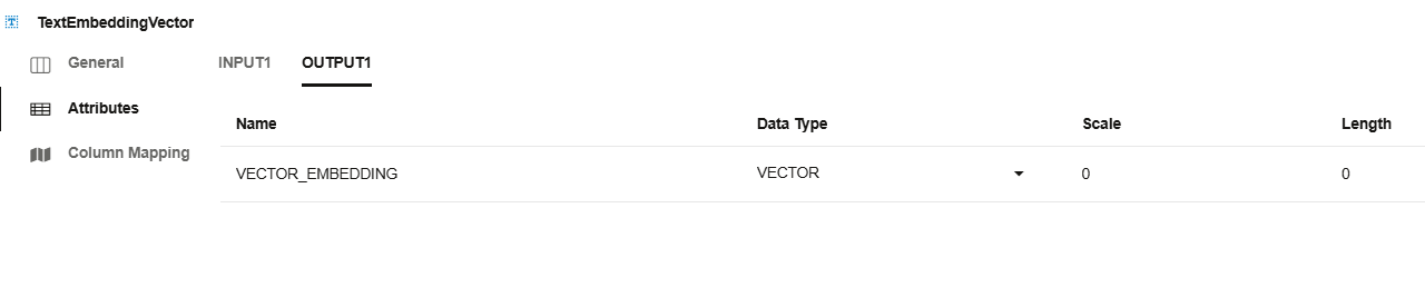 In the Attributes section, you will notice there is an output called VECTOR_EMBEDDING. Optionally you can change this name to be more meaningful. We will leave it as it is.
