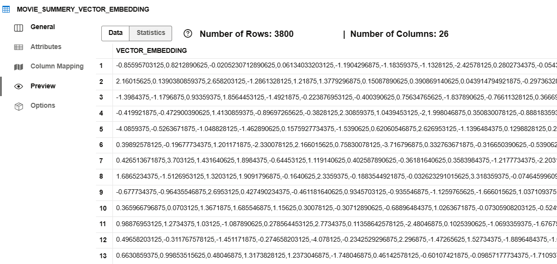 Now create a new column of VECTOR data type in the target table MOVIE_SUMMARY_VECTOR_EMBEDDING.