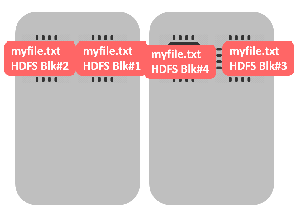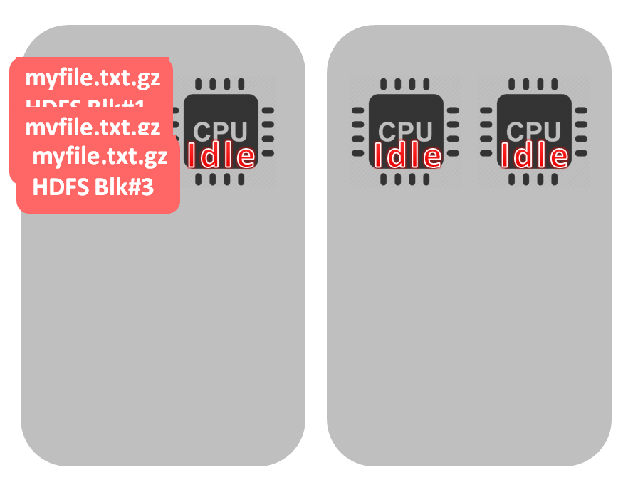 What would be the case of a non-splittable file – like gzip? The file would be split into 4 HDFS blocks (during data loading into HDFS), like in example above. The difference begins when we start processing this file – all blocks would be processed by a single cpu. In our example one core will be occupied while 3 others are idle.