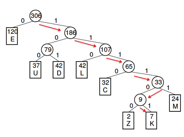 Most rare symbol is “Z”, next one from the end is “K”. Z happens 2 times, “K” – 7. Sum is 9 it’s less than 24 – occurrence of the “M” symbol which is following by “K”. Put 0 bit for the less branch… after accomplishing all steps for all symbols, we could observe follow tree: