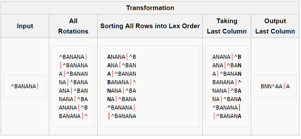 “The transform is done by sorting all rotations of the text into lexographic order, by which we mean that the 8 rotations appear in the second column in a different order, in that the 8 rows have been sorted into lexicographical order. We then take as output the last column:”