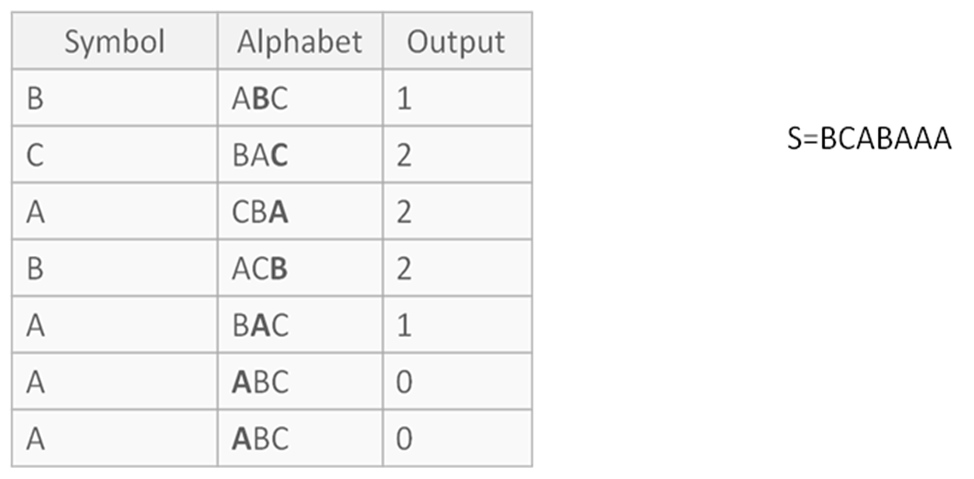 Couple paragraphs above, we have learned (or remembered) what is the Huffman coding is. And it’s obviously very efficient algorithm for dataset where frequency of appearance of each symbol is different. But what is we have text like this “bbbbbcccccdddddaaaaa” From Mr.Huffman’s perspective it’s pretty unuseful – probability for each symbol is equal. But this dataset seems promising. Move-to-Front transformation allows us to use benefits of this text. The main idea of this method is that each symbol in the data is replaced by its index in the stack of “recently used symbols”. For example, long sequences of identical symbols are replaced by as many zeroes, whereas when a symbol that has not been used in a long time appears, it is replaced with a large number. For this transformation we have to write alphabet in lexicographical order for first iteration and mute it during the transformation. Here is example: