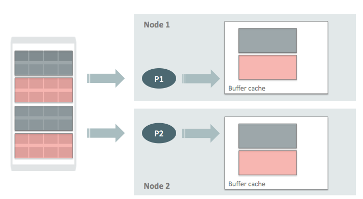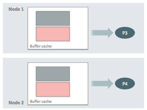 Now, half of the table is cached in node 1 and the other half is cached on node 2. When another parallel statement comes and accesses the same table, as you can see in the below picture the PX servers assigned to this statement (P3 and P4) will read the data from their node’s buffer cache instead of going to storage and doing IO. Note that cache fusion is not used to read data from other node’s memory, all buffer cache access is local.