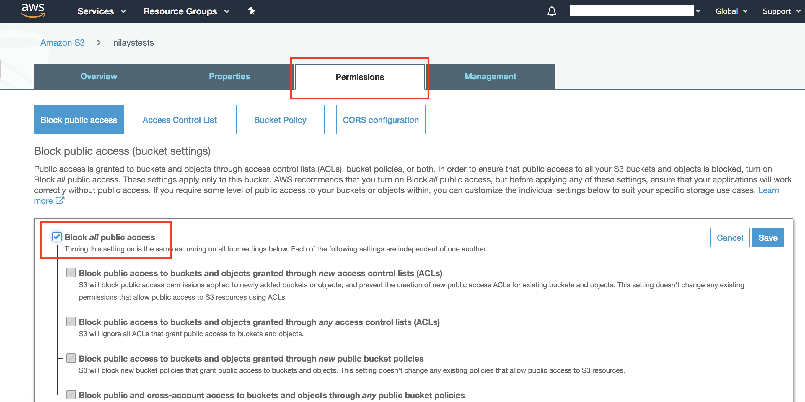 Keep note of the Permissions of your bucket (you can use a Private or Public access) in which you uploaded the files. This will come in handy in Step 3.