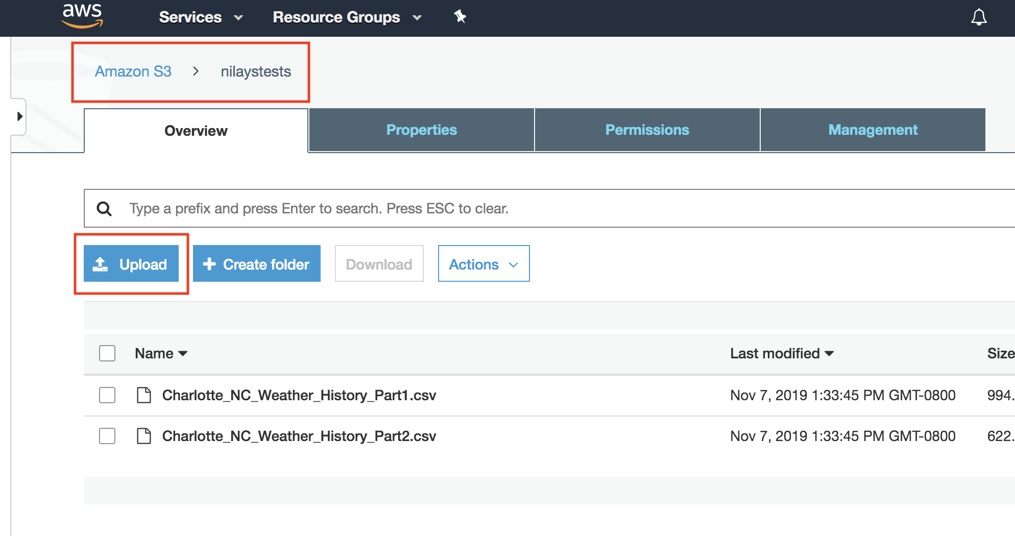 Navigate to your AWS S3 storage account, create a bucket and unzip and upload the two Weather history files. (Refer to these detailed steps on how to do this if necessary).