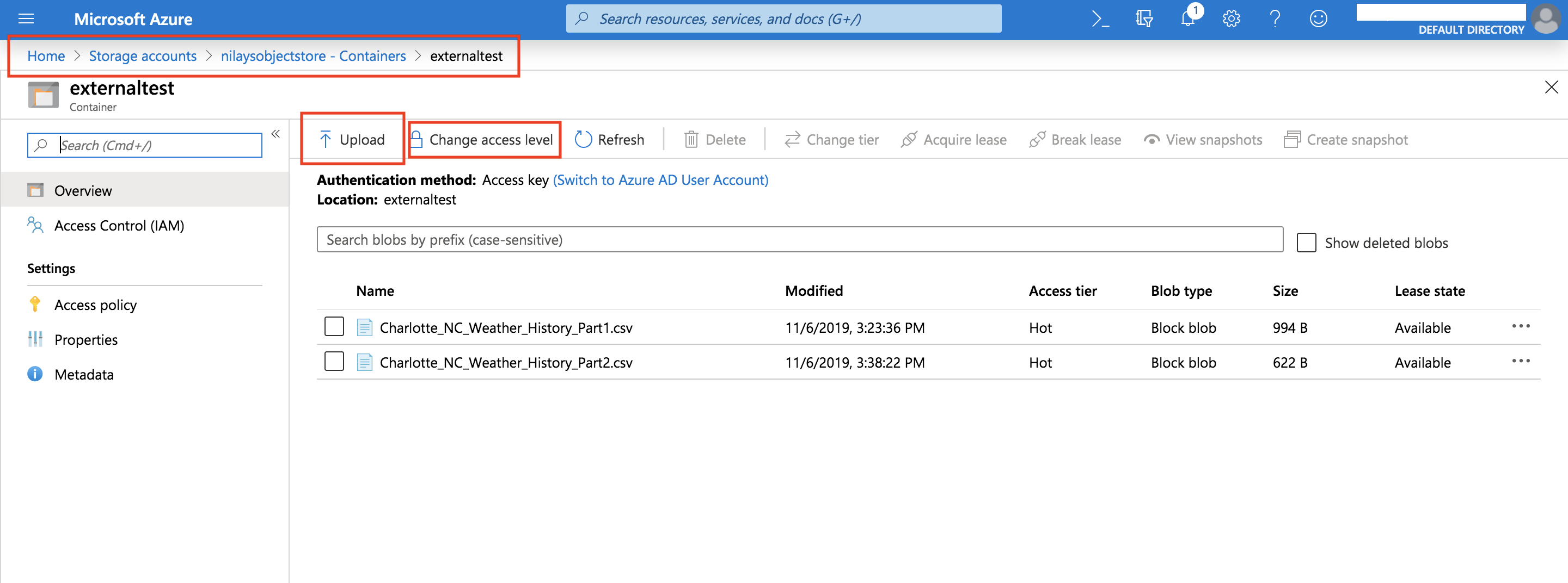 Navigate to your Azure Blob Storage account, create a container and unzip and upload the two Weather history files. (Refer to these detailed steps on how to do this if necessary).