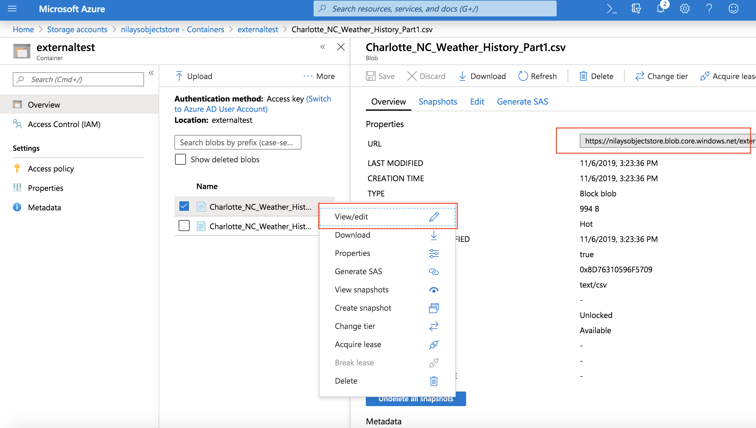 Now that we have a credential ready, run the PL/SQL script below using your Azure Blob store URLs in the location parameters. You may either construct the URLs yourself by looking at the URL format or find the URL from the details of your file in the blob store console as in the following screen: