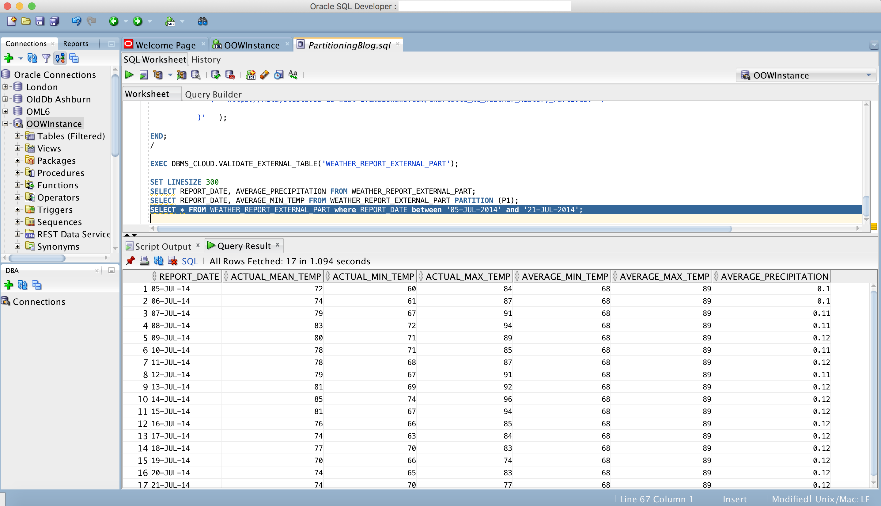 SELECT REPORT_DATE, AVERAGE_MIN_TEMP FROM WEATHER_REPORT_EXTERNAL_PART PARTITION (P2); SELECT * FROM WEATHER_REPORT_EXTERNAL_PART where REPORT_DATE between '05-JUL-2014' and '21-JUL-2014';