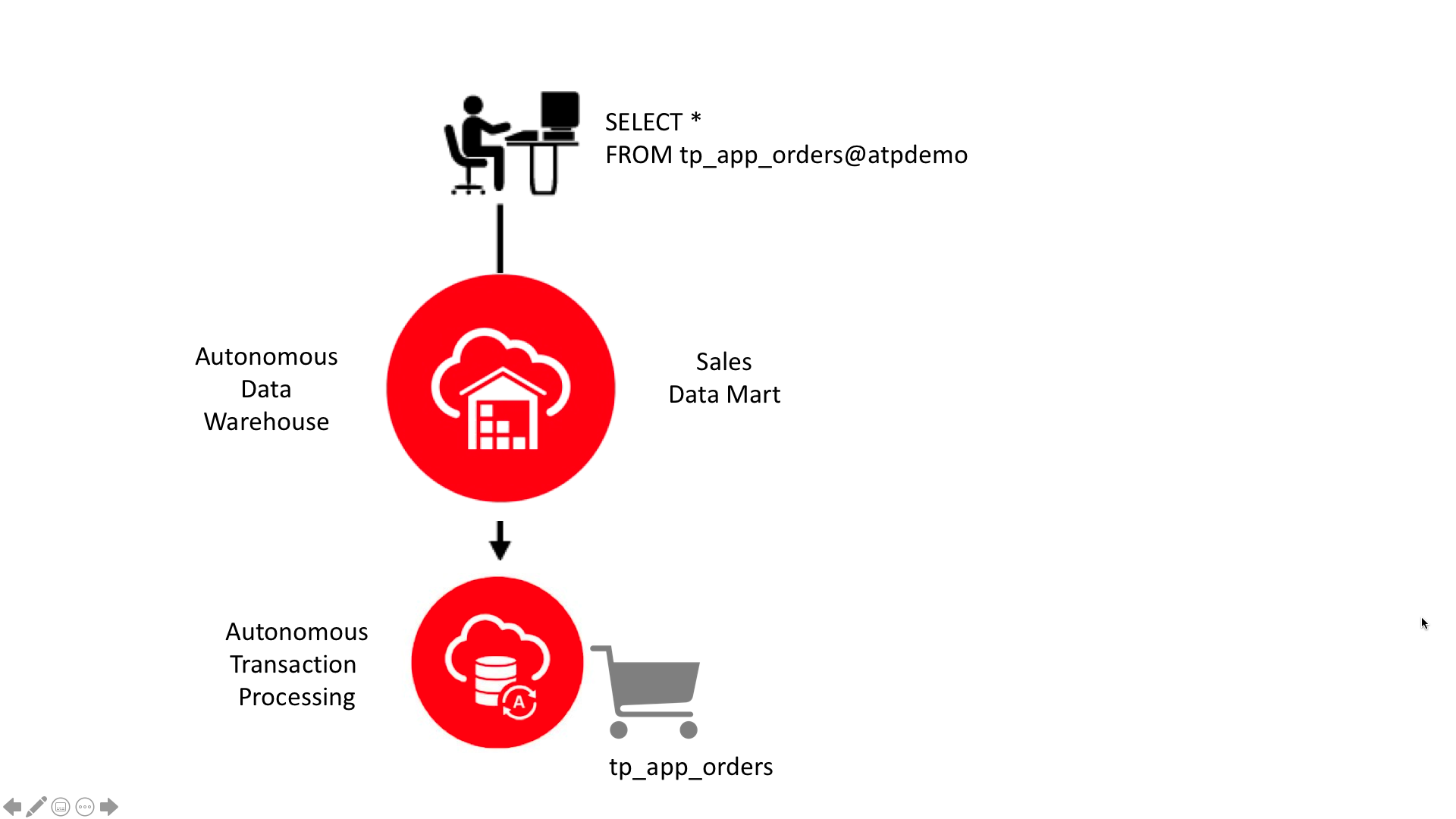 Let’s assume that I have an ATP instance running a web store application that contains information about sales orders, distribution channels, customers, products etc. I want to access some of that data in real-time from within my sales data mart.