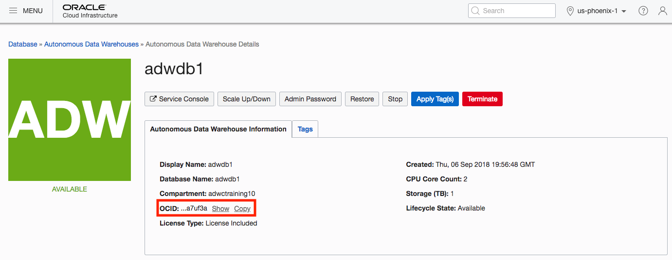 To find the database OCID for your ADW instance you can either look at the output of the list databases API I mentioned above or you can go the ADW details page on the OCI web interface which will show you the OCID.