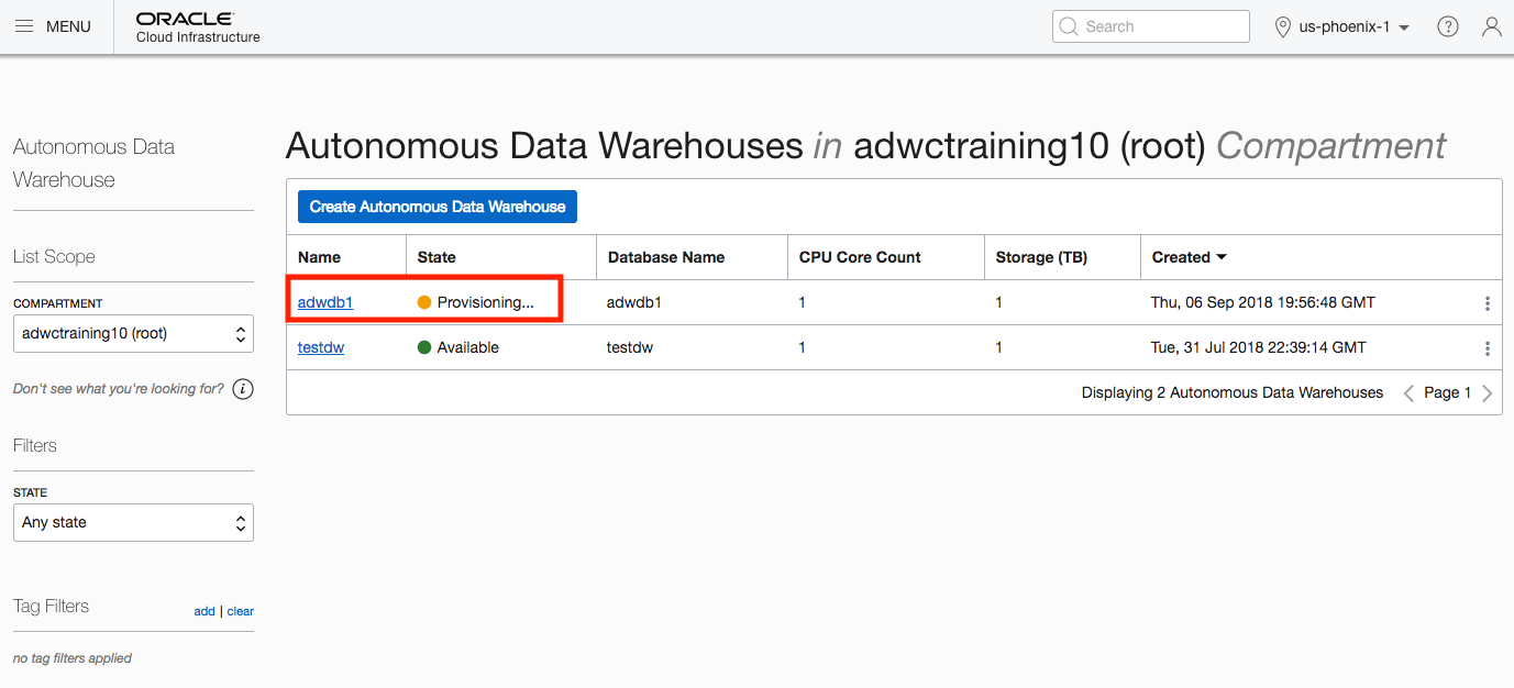 "serviceConsoleUrl": "https://adb.us-phoenix-1.oraclecloud.com/console/index.html?tenant_name=OCID1.TENANCY.OC1..AAA53JZWMRLMUQOLOYDLOTTHKRBQ&database_name=ADWDB1&service_type=ADW",