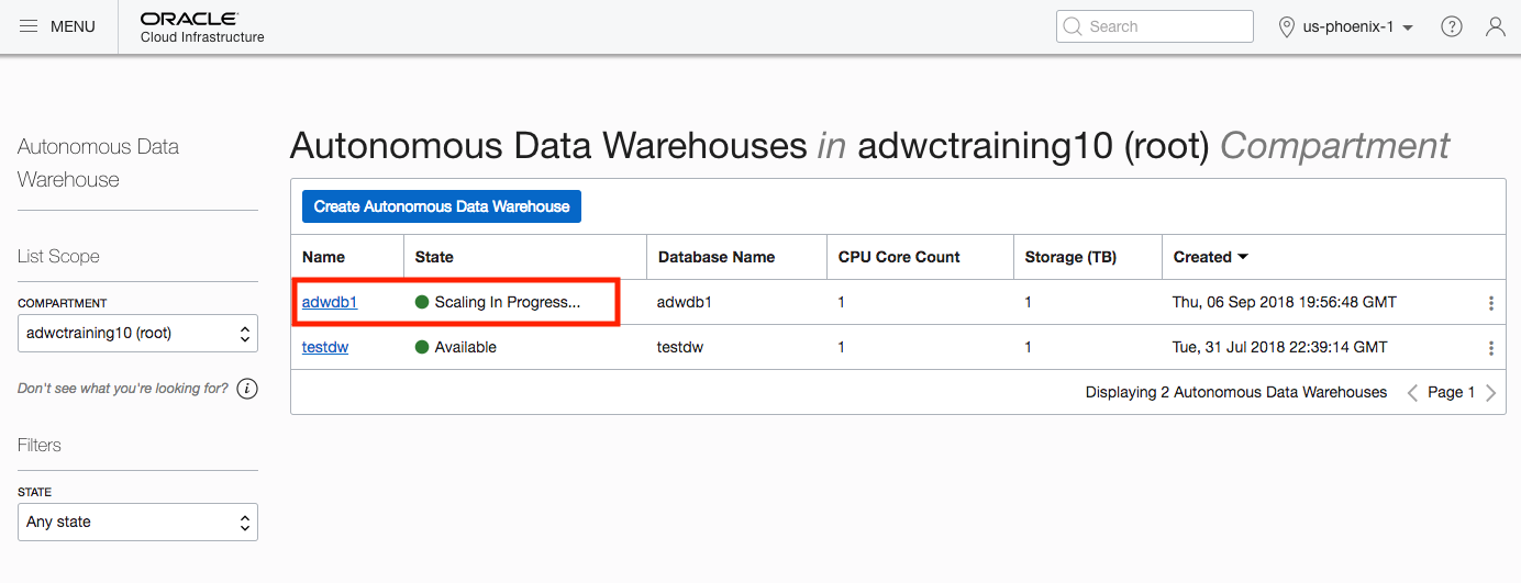 If you go to the OCI web interface again you will see that the status for that ADW instance is shown as Scaling in Progress.