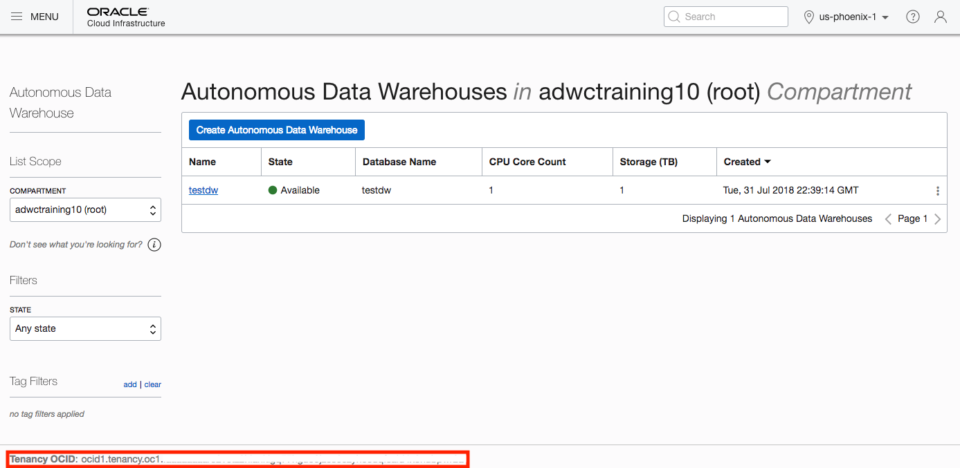 "serviceConsoleUrl" : "https://adb.us-phoenix-1.oraclecloud.com/console/index.html?tenant_name=OCID1.TENANCY.OC1..AAAAAAAAKC2XKEHAKT7BMHMIPDBHZ&database_name=ADWDB1&service_type=ADW",