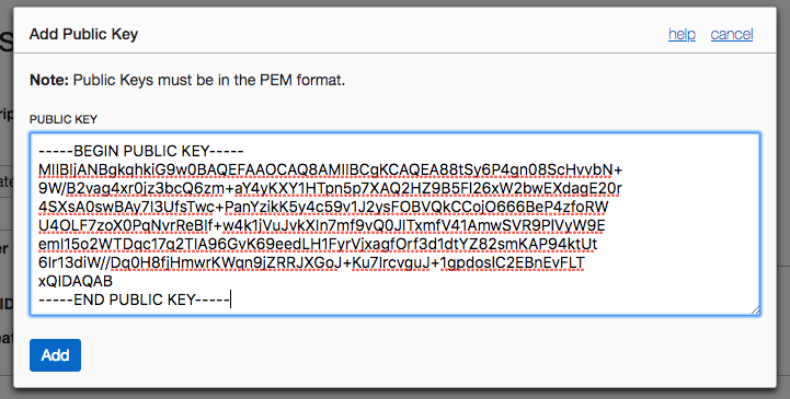 Click the Add Public Key button and copy and paste the contents of the file oci_api_key_public.pem into the text field, click Add to finish the upload.