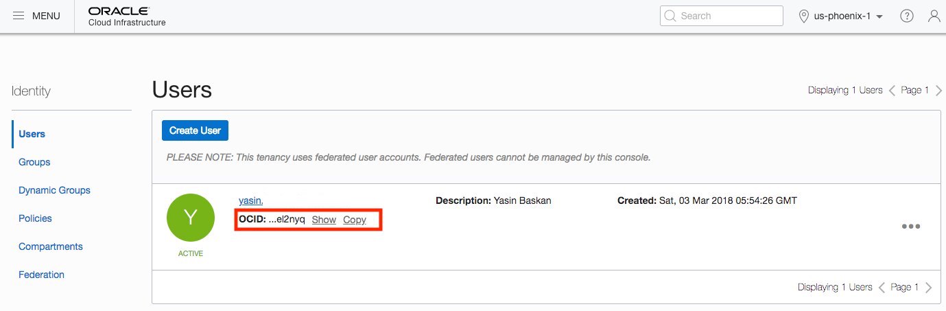 This is the OCID of the user who will perform actions using oci-curl. This user needs to have the privileges to manage ADW instances in your OCI tenancy. You can find your user OCID by going to the users screen as shown in this screenshot.