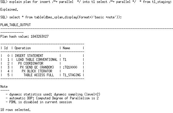 We can see that parallel DML is not enabled for the above statement indicated by the LOAD operation being above the PX COORDINATOR in the plan. In 12c the notes section nicely and clearly shows that it is not enabled.