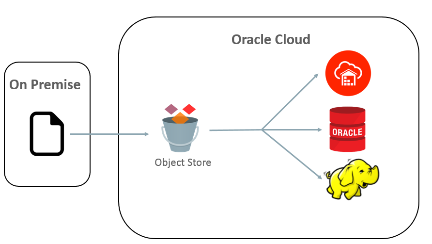 You land it there and then either read or load it by different services, such as ADWC or BDCS, for example. Oracle has two flavors of Object Store Services (OSS), OSS on OCI (Oracle Cloud Infrastructure) and OSS on OCI -C (Oracle Cloud Infrastructure Classic).