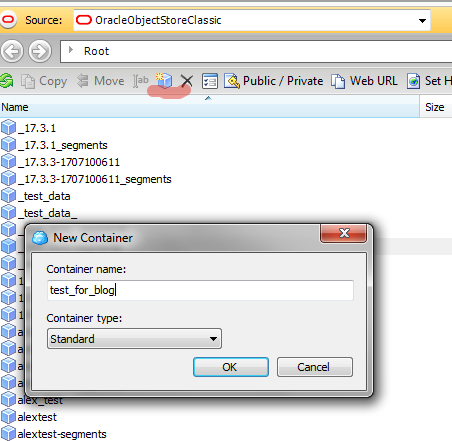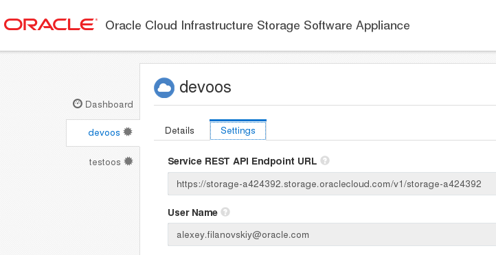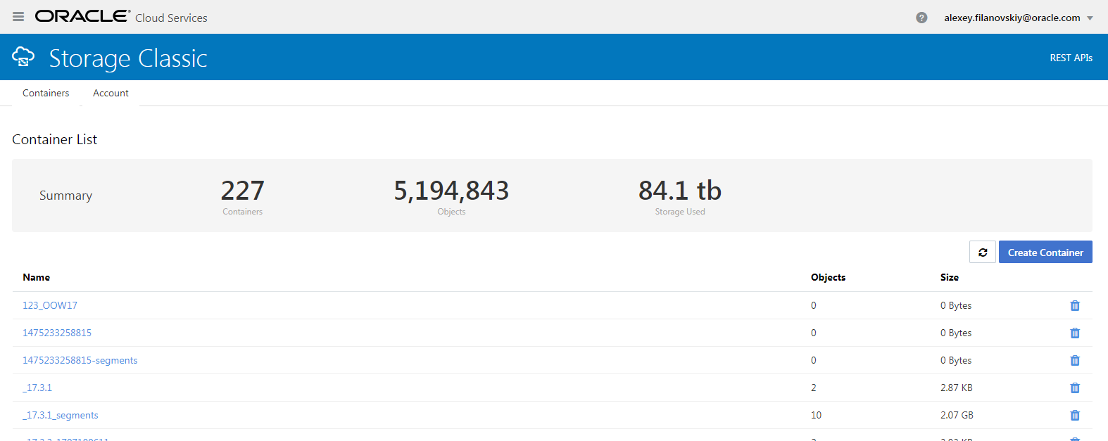 curl -k -sS -H "X-Storage-User: storage-a424392:alexey.filanovskiy@oracle.com" -H "X-Storage-Pass:MySecurePass" -i "https://storage-a424392.storage.oraclecloud.com/auth/v1.0" Token and storage URL: OSS url: https://storage-a424392.storage.oraclecloud.com/auth/v1.0 auth token: AUTH_tk45d49d9bcd65753f81bad0eae0aeb3db storage token: AUTH_tk45d49d9bcd65753f81bad0eae0aeb3db storage url: https://storage.us2.oraclecloud.com/v1/storage-a424392 Containers: 123_OOW17 1475233258815 1475233258815-segments Container ... Actions: Listing containers: curl -k -vX GET -u "alexey.filanovskiy@oracle.com:MySecurePassword" "https://storage.us2.oraclecloud.com/v1/storage-a424392/"