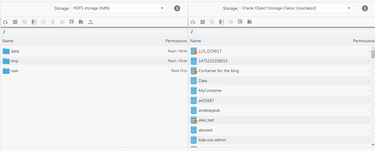 Big Data Cloud Service (BDCS) has great component called Big Data Manager. This is tool developed by Oracle, which allows you to manage and monitor Hadoop Cluster. Among other features Big Data Manager (BDM) allows you to register Object Store in Stores browser and easily drug and drop data between OSS and other sources (Database, HDFS…). When you copy data to/from HDFS you use optimized version of Hadoop Distcp tool ODCP.