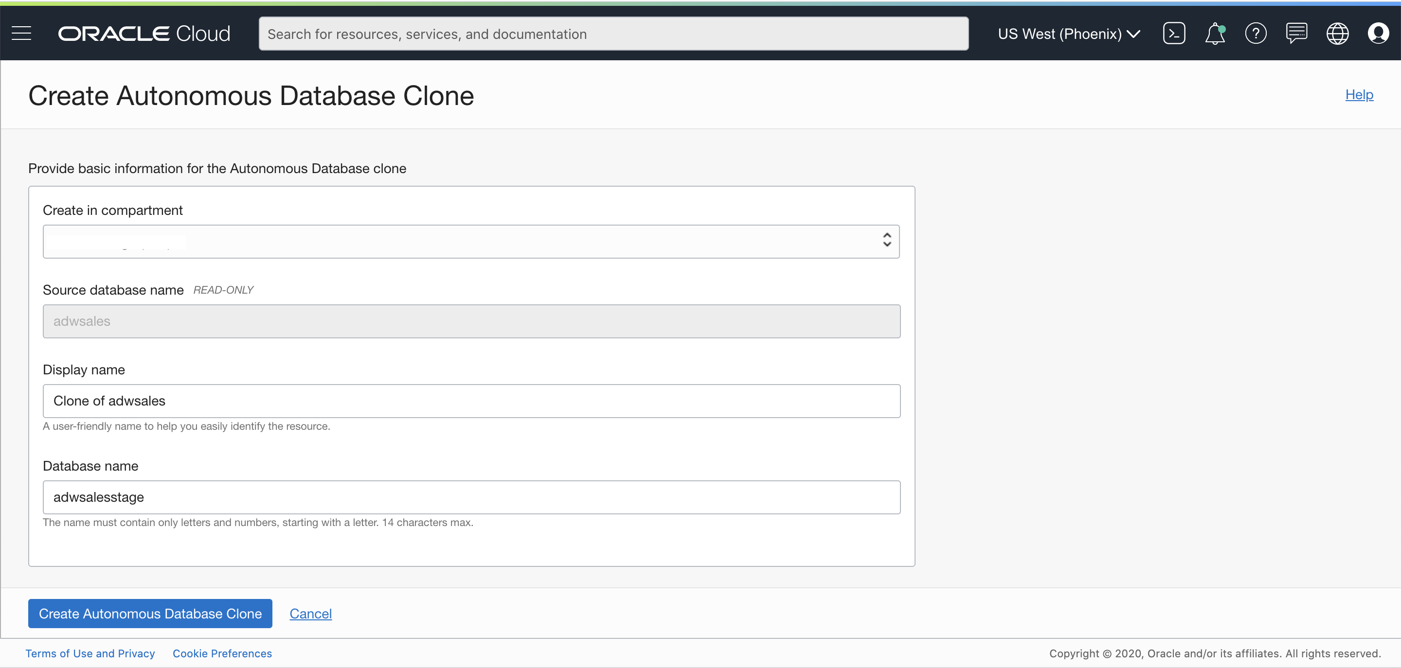 Since we want to maintain a fresh copy of our production database, let’s create a new clone called adwsalesstage, soon to be our new test database: