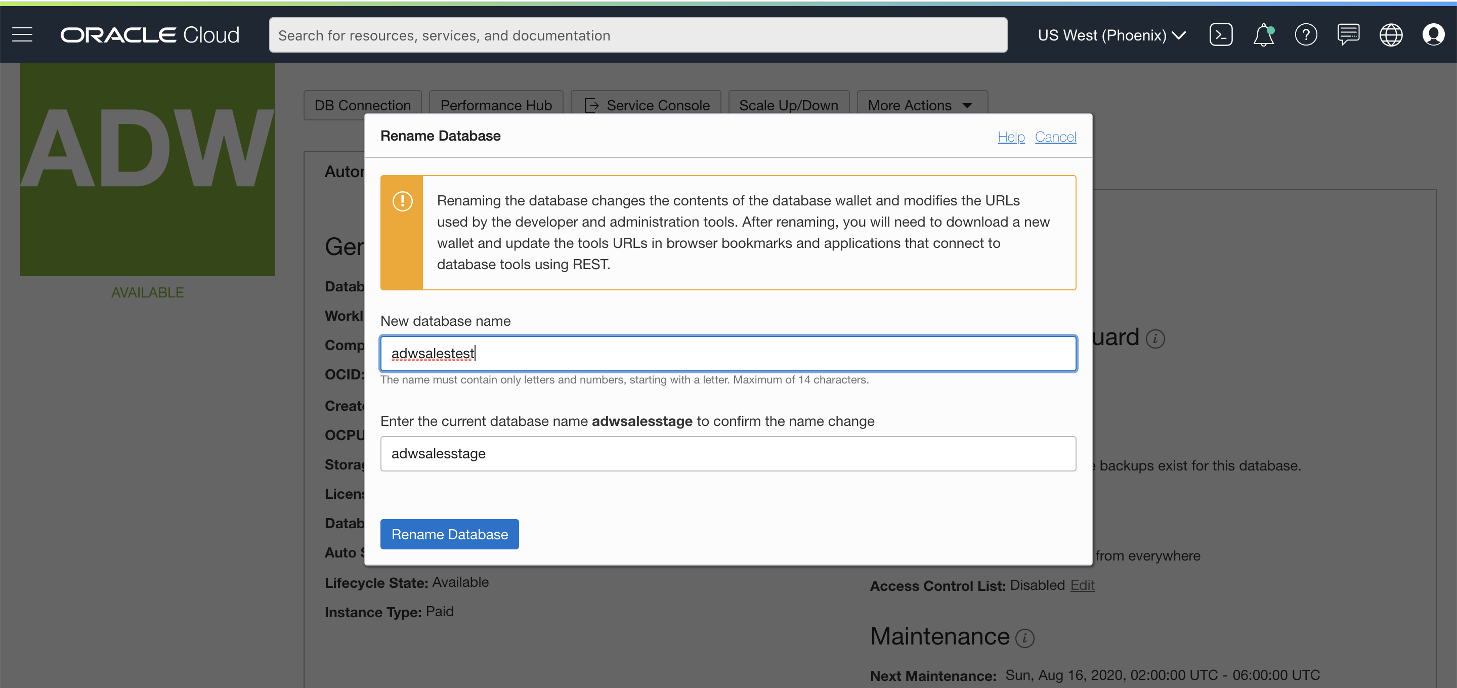 One of the key advantages of Autonomous Database on Shared Exadata Infrastructure (ADB-S) is to be able to provision or clone a database with the click of a button. This is especially important in the context of agile development and testing (DevTest) in which the teams often need a fresh copy of the production environment in order to make sure the new projects, enhancements, or bug fixes solve the existing problems and don’t cause new issues in the production environment. Many ADB-S customers do this by frequently cloning their production databases for their DevTest teams because cloning an ADB-S instance requires very little effort and fits perfectly in the agile development lifecycle. In this blog post, we are going to explore how to further accelerate this cycle with the help of a new ADB-S capability that enables you to rename your existing ADB-S instance.