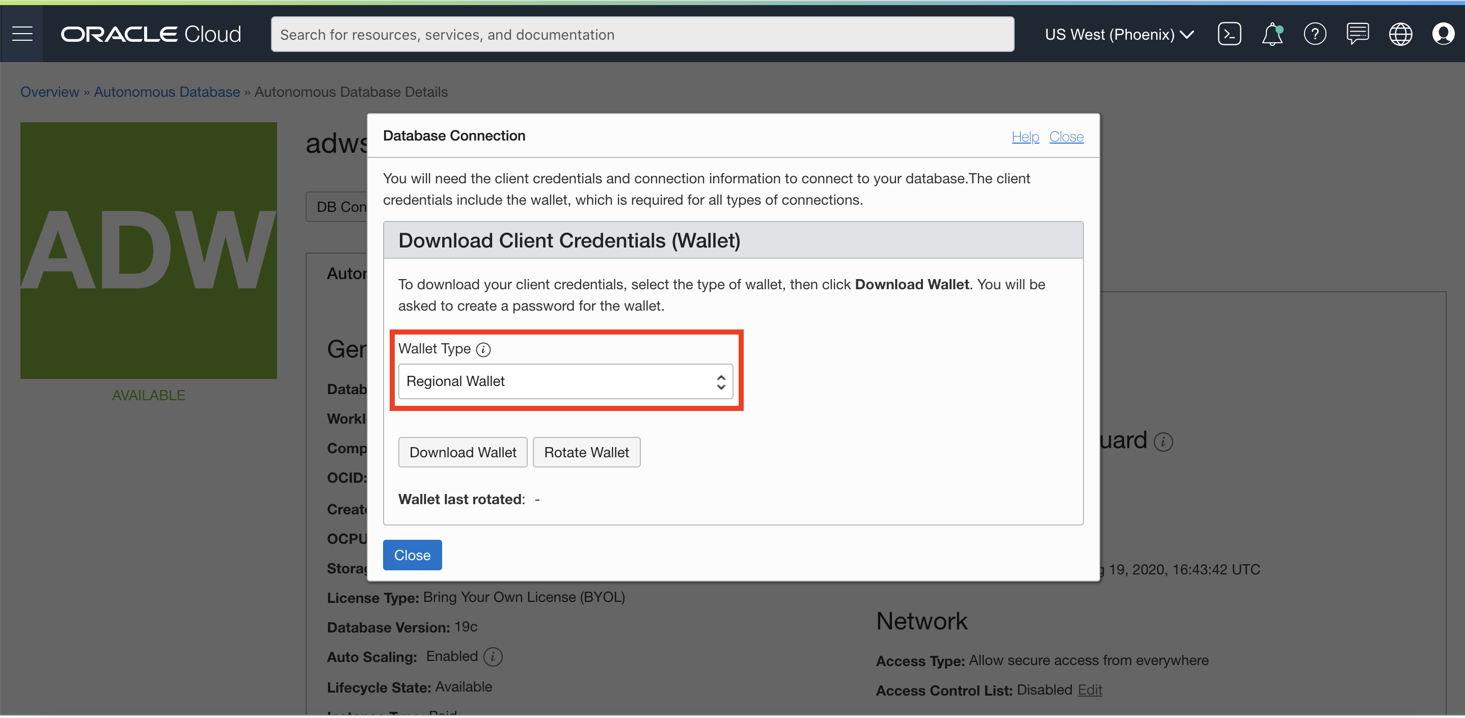 In this demonstration, I have two ADB-S instances:adwsalesis my production database andadwsalestestis my test database that I cloned fromadwsales. We are going to first download our regional wallet. The reason for using the regional wallet instead of the instance wallet is to avoid downloading a new wallet every time we create a new clone of the production since regional wallet serves all the instances that belong to the same tenancy in a given region.