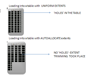 For performance reasons most loads leverage direct path operations where the load process directly formats and writes Oracle blocks to disk instead of going through the buffer cache. This means that the loading process allocates extents and fills them with data during the load. During parallel loads, each loader process will allocate it own extent and no two processes work on the same extent. When loading data into a table with UNIFORM extents each loader process will allocate its own Uniform extent and begin loading the data, if the extents are not fully populated the table is left with a lot of partially filled extents, effectively creating ‘HOLES’ in the table. Not only is this space wastage but it also impacts query performance as subsequent queries that scan the table have to scan all of the extents even if they are not fully filled.