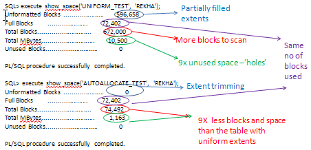 As you can see from the results there are no unformatted blocks in the autoallocate table as extent trimming has taken place after the load was complete. The same can not be said for the uniform_test table. It is quite evident from the numbers that there is substantial space wastage in the uniform_test table. Although the count of full blocks are the same in both cases, the Total Mbytes used is 10x greater in the Uniform table.