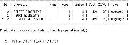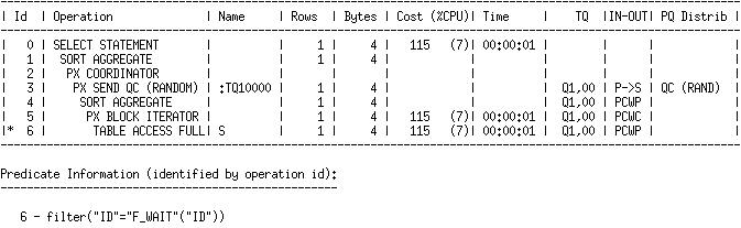 SQL> select /*+ parallel(4) */ count(*) from s where id=f_wait(id);