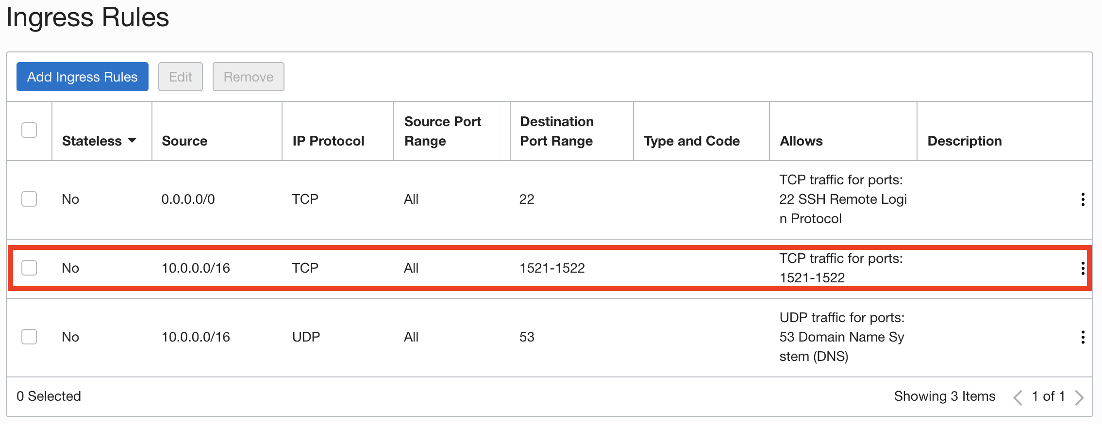 - An ingress rule in the target database’s subnet security list or network security group such that the traffic over TCP is allowed from the source database IP address to the destination port. For example: