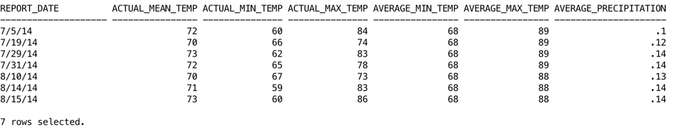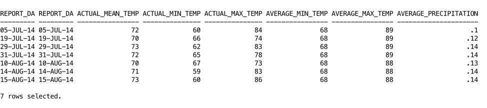 On running this validation without errors, you now have a working external table which sits on top of the data in your object store. You may now query and join the WEATHER_REPORT_CSV table as though it is any other table in your Data Warehouse! Let us find the days in our dataset during which it was pleasant in Charlotte.