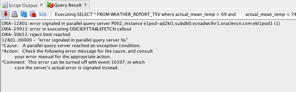 BEGIN DBMS_CLOUD.VALIDATE_EXTERNAL_TABLE ( table_name => 'WEATHER_REPORT_CSV' ); END; /