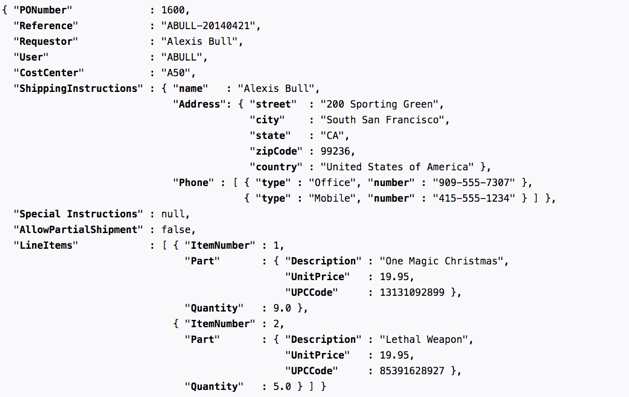 You may be familiar with JSON files for unstructured and semi-structured data. The “PurchaseOrders.txt” file contains JSON Purhcase Order data, which when parsed and formatted looks like the following.