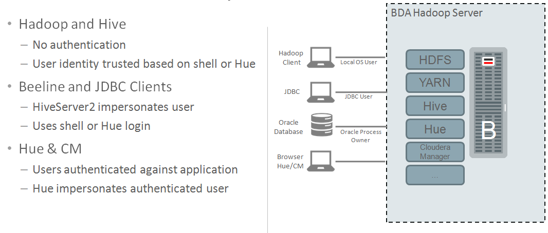 By design, Hadoop doesn’t have any security. So, if you spin up a cluster – by default it’s insecure. It assumes a level of trust; and assumes that only trusted users have access to the cluster. In HDFS, files and folders have permissions – similar to Linux – and users access files based on access control lists – or ACLs. See the diagram below that highlights different access paths into the cluster: shell/CLI, JDBC, and tools like Hue.