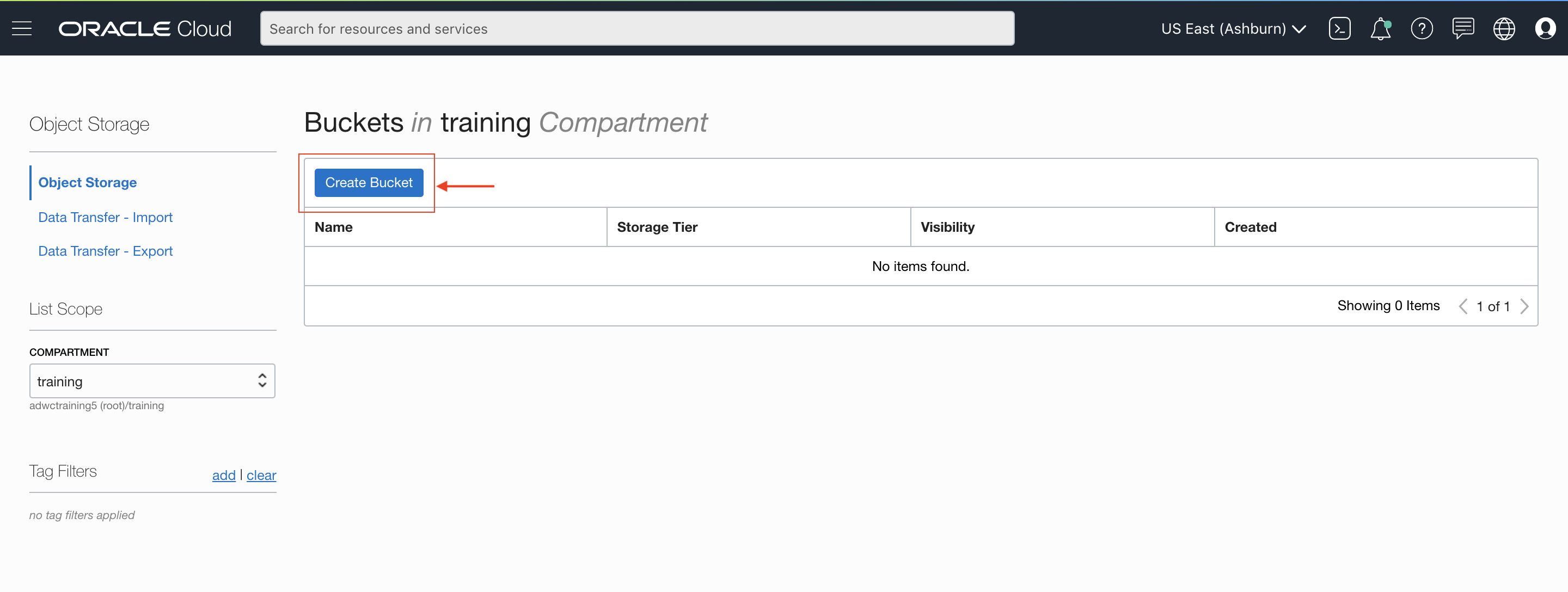 Using the hamburger menu on the left, navigate to your Object Storage. Select a compartment which you would like to put your data in and hit “Create Bucket”. The default options work well; In the popup, enter a bucket name (we will use ‘examplebucket’) and continue on to create the bucket . This bucket will hold your exported dump files.