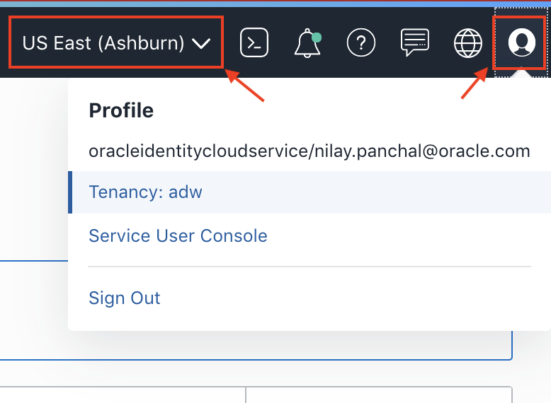 - <region ID> with the region you are using. You can identify this by looking at the top right corner of your Oracle Cloud page. Go into “Manage Regions” or look at this page to get your region’s identifier.